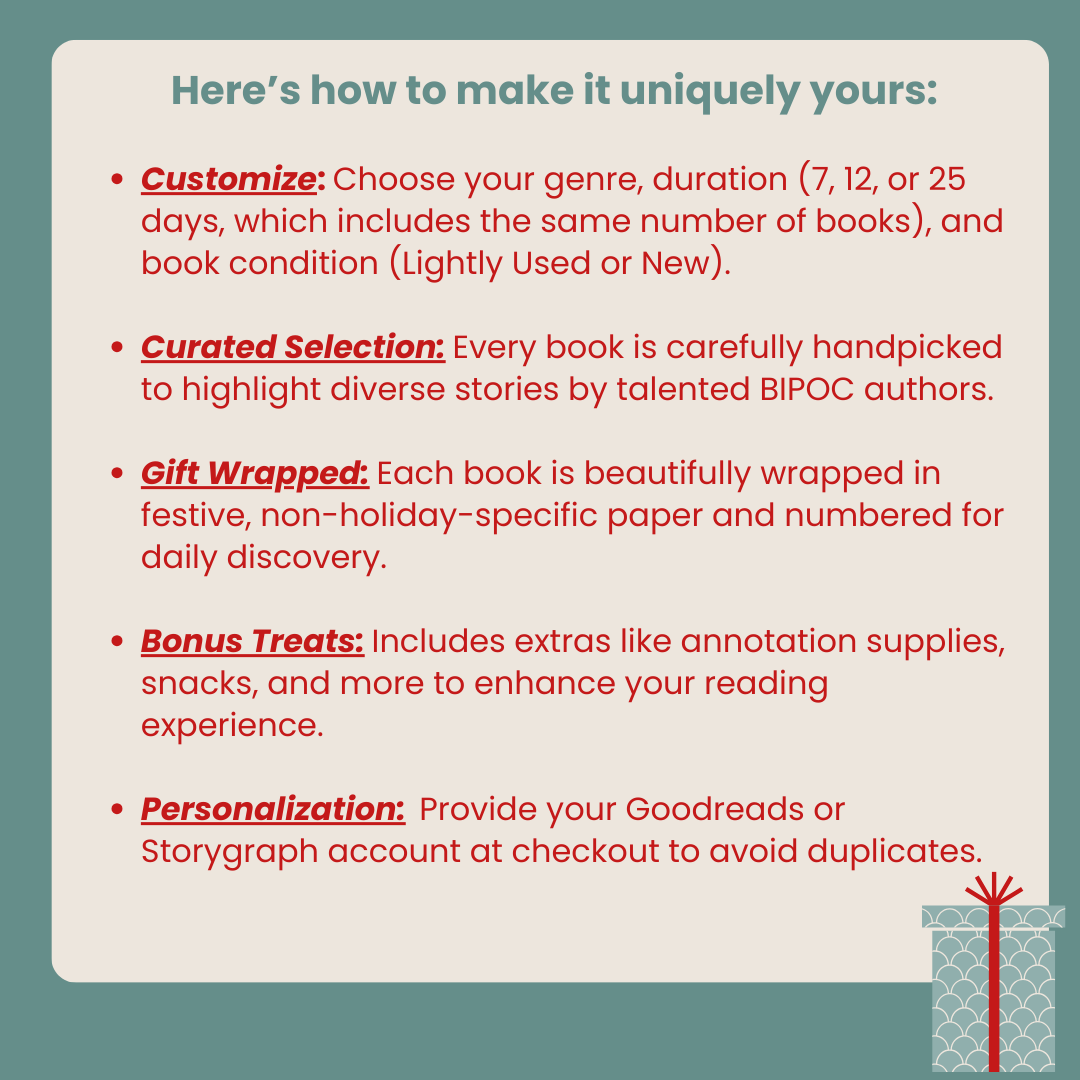 Step into the ultimate reading experience with our Blind Date with a Book Advent Box β where mystery meets magic. Choose your bundle size, select your favorite genre, and let us handpick beautifully wrapped books curated just for you.